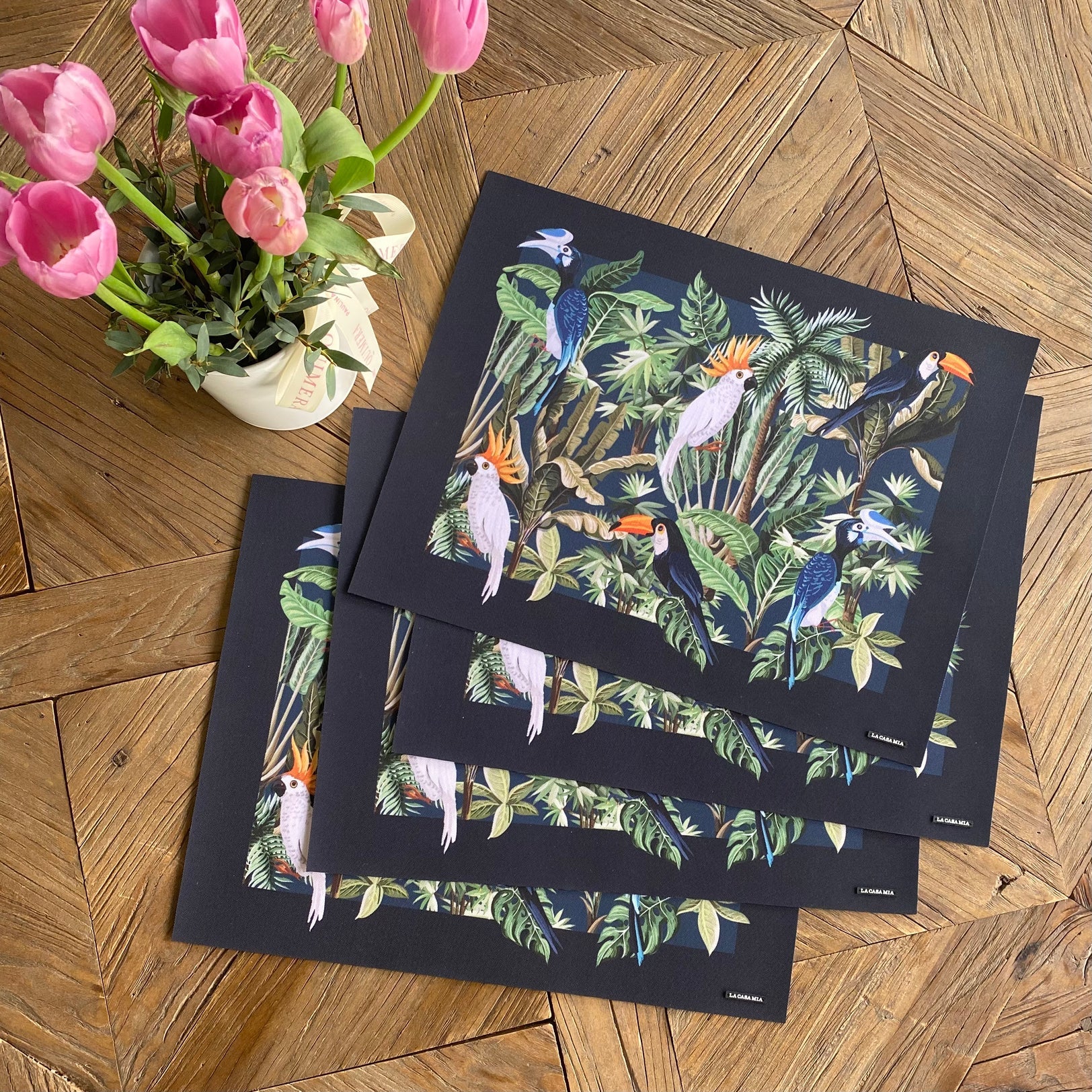 Individual de uso diario “aves tropicales con marco azul” ha